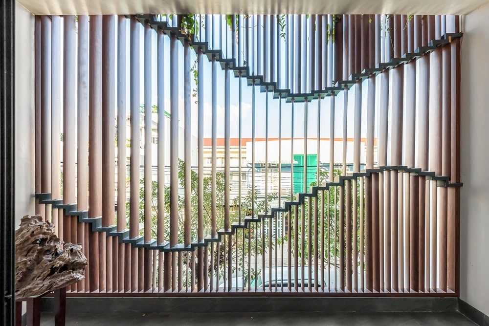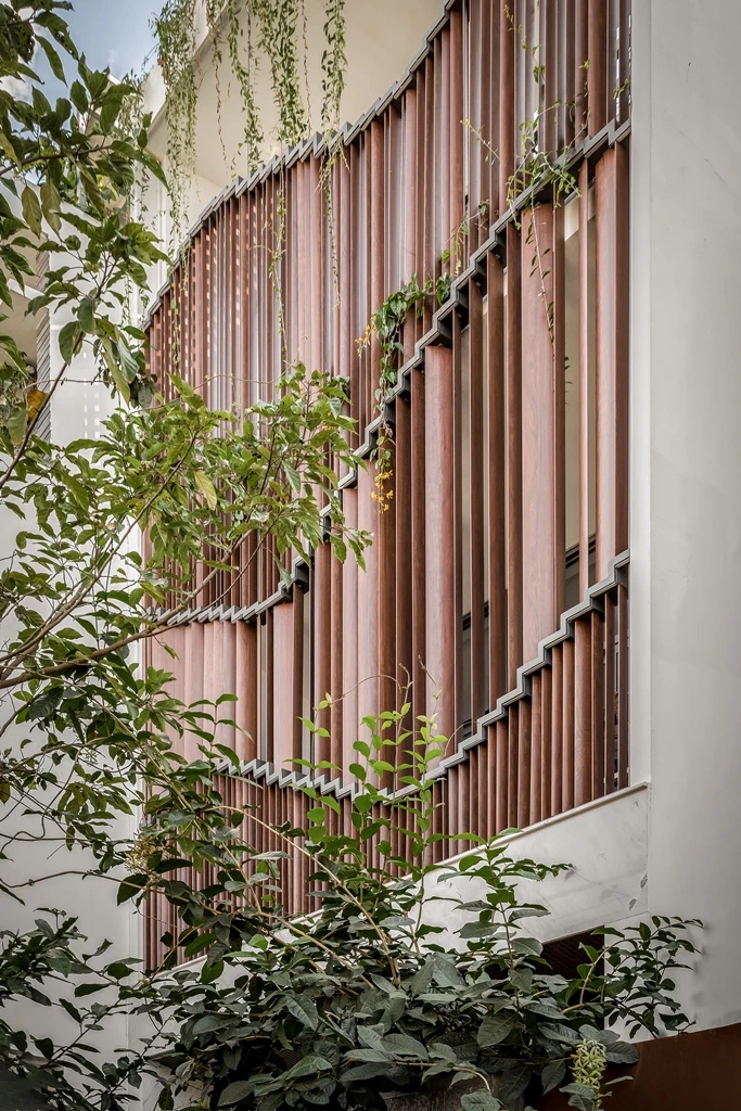 Hệ cửa kính lùa bên trong và điều chỉnh hệ lam gỗ xoay mở để gió mát tự nhiên vào bên trong nhà. Ngoài ra, hệ lam cũng có khả năng giảm bớt tiếng ồn và hạn chế bụi bặm từ đường phố.