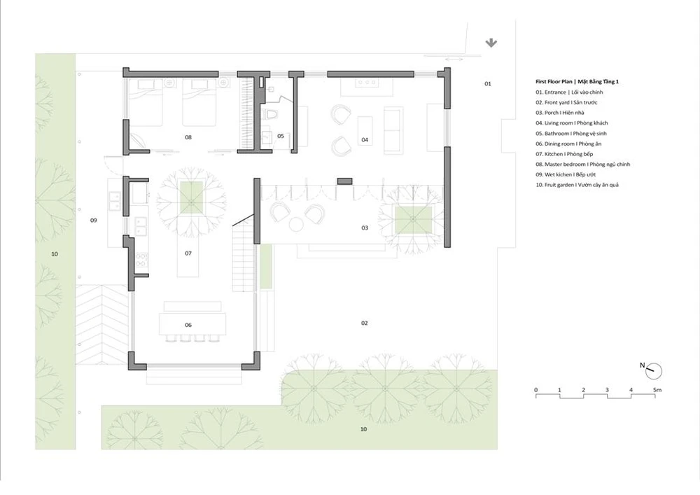Kiến trúc sư đã bố trí hàng hiên đóng vai trò một không gian đệm chuyển tiếp giữa trong nhà và ngoài nhà, đồng thời là không gian giảm nhiệt cho phòng khách với việc kết hợp trồng cây xanh che nắng.