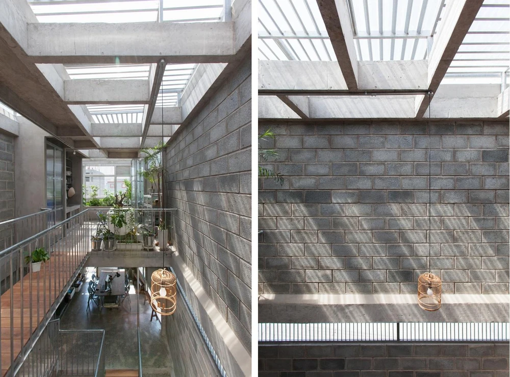 | Ngôi nhà được chia thành hai phần bởi một giếng trời lớn ở giữa. |