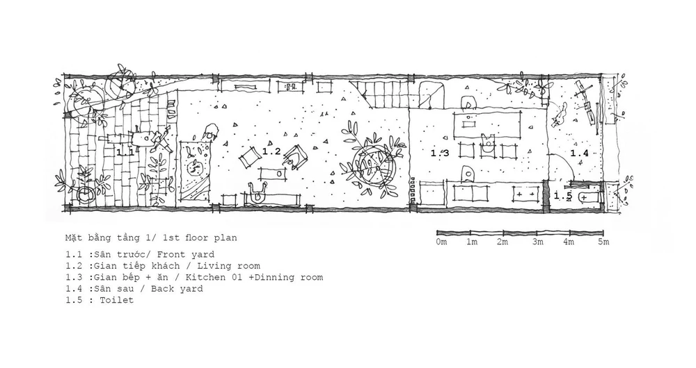 | Phần phía trước của ngôi nhà gồm không gian thờ cúng, nơi làm việc và vườn rau. |