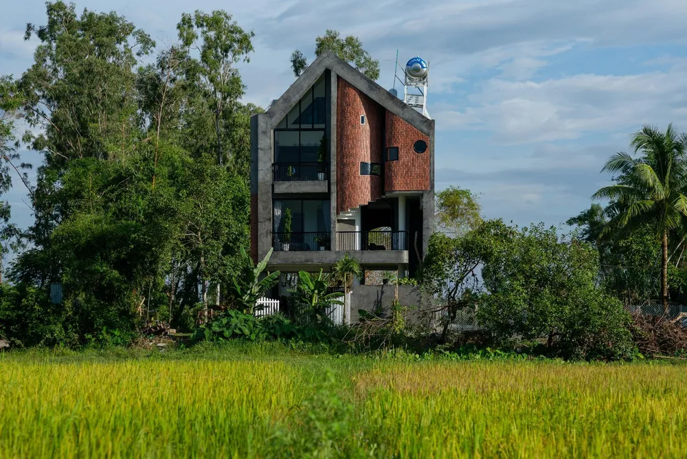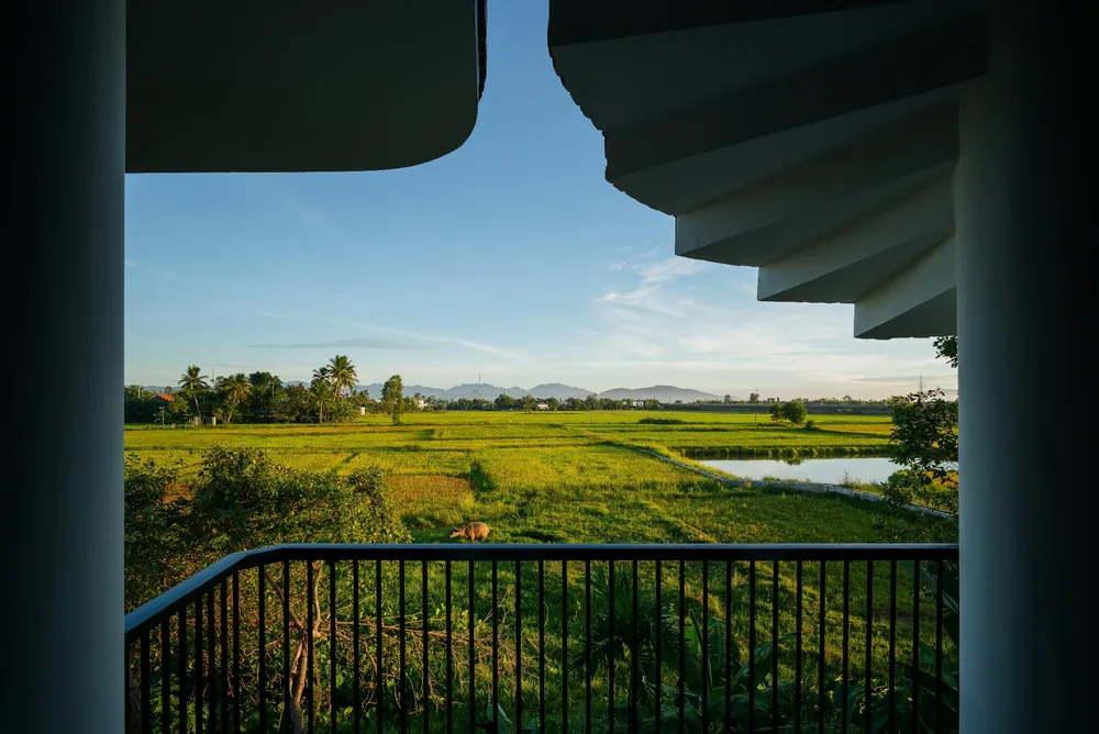 Nơi công trình tọa lạc là một một vùng quê êm đềm với cánh đồng và những rặng tre xanh ngát.