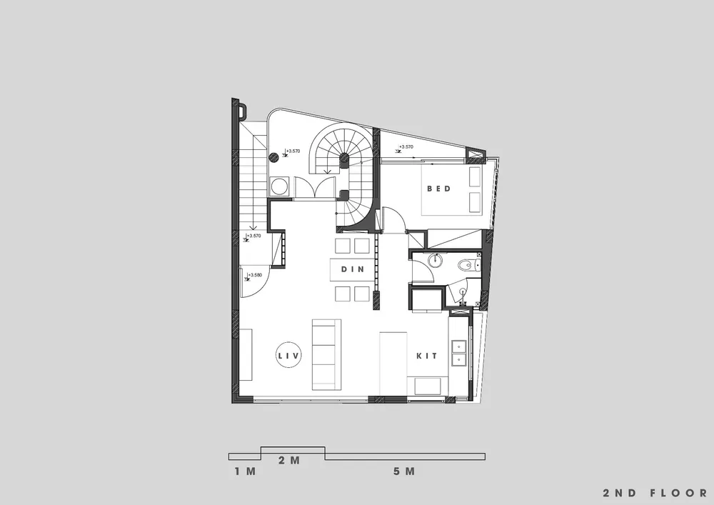 Tầng hai là không gian sinh hoạt chung bao gồm phòng khách liền kề bếp, bàn ăn và phòng ngủ nhỏ.
