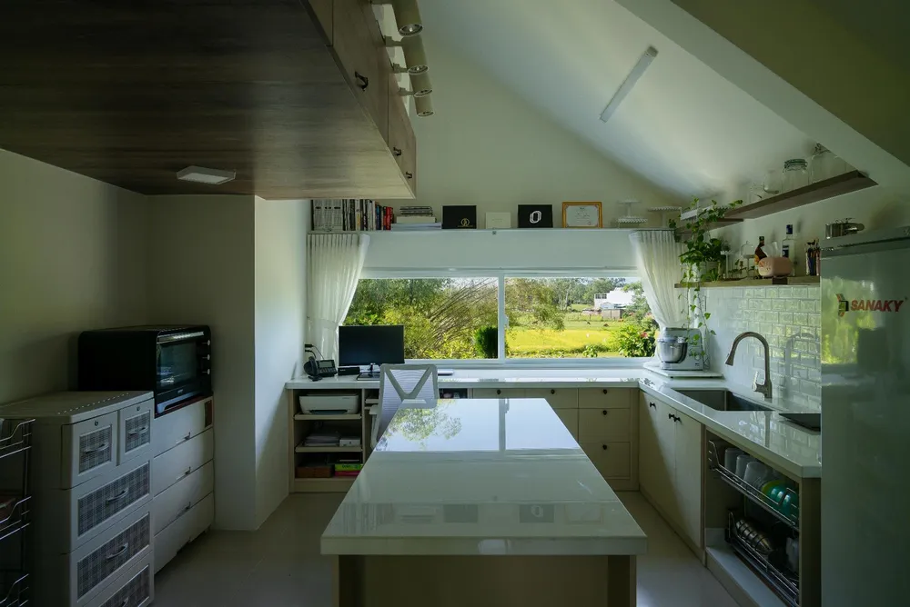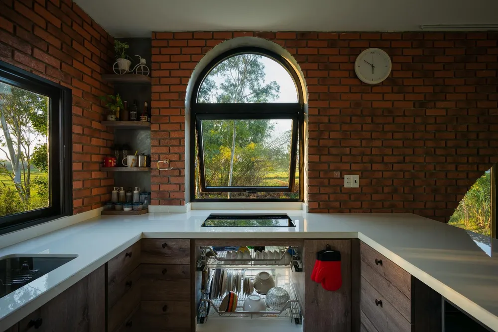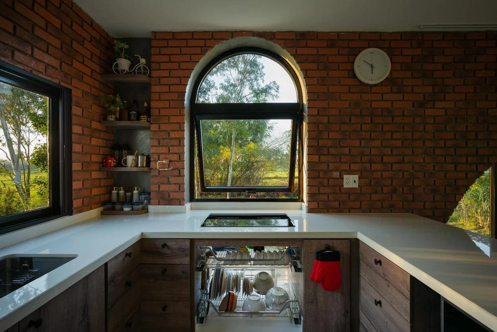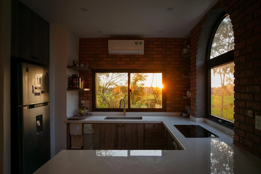 Ánh bình mình và hoàng hôn chiếu vào gian bếp nhìn rất thơ mộng nhờ thiết kế nhiều ô cửa số kính trong suốt.