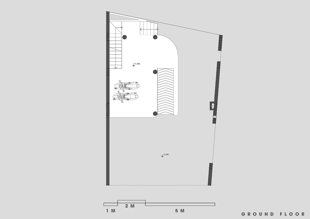 Do đó, kiến trúc sư đưa ra giải pháp đưa công năng sử dụng chính của nhà sẽ đưa lên tầng hai, tầng trệt bỏ trống là khu vực để xe và không gian cà phê của gia chủ.