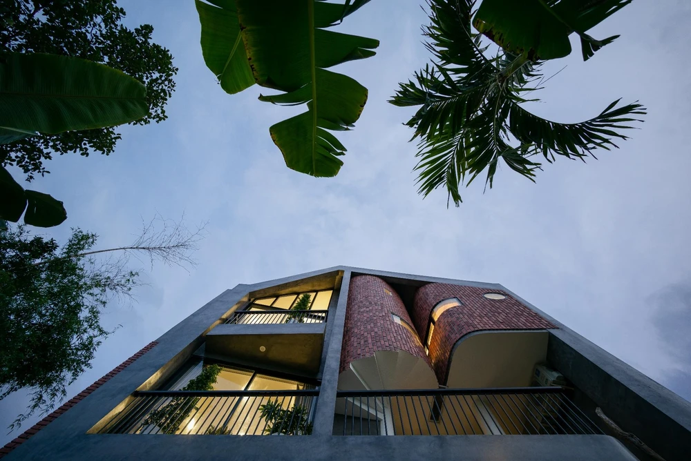 Mặt tiền nhà thiết kế độc đáo với những hàng gạch nung đỏ, bố trí hài hòa với nhiều mảng bê tông bao quanh từ trước ra sau nhà.