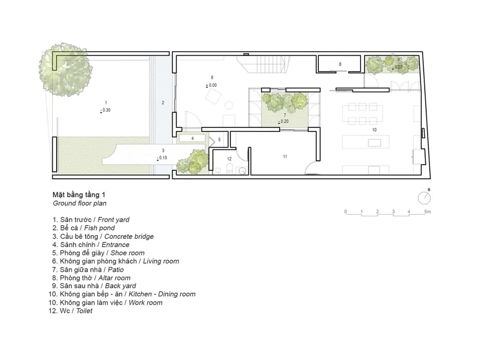 Sân thứ ba là sân cảnh quan, thông gió khu bếp, phòng vệ sinh chính và phòng ngủ chính theo trục đứng.