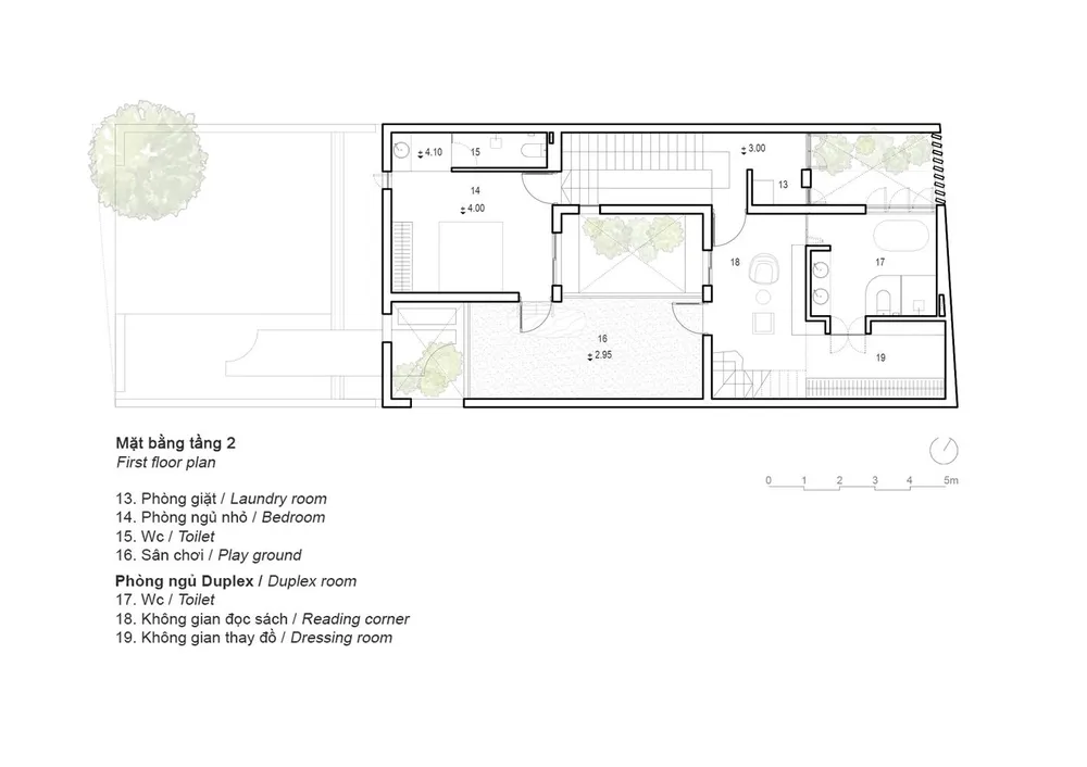 Tre xuất hiện ở cả ba khoảng sân góp phần tạo mảng xanh và những đường nét khỏe khoắn.