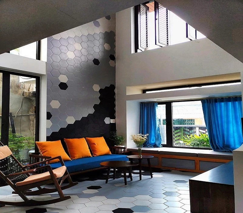 Điều đặc biệt của ngôi nhà là cách sử dụng gạch lục giác ba màu đen, xám trắng tạo điểm nhấn cho phòng khách. Sau đó, kết hợp vừa ốp tường vừa lát nền tạo sự liên kết.