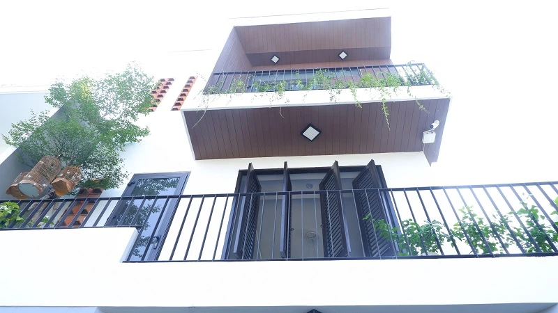 Toàn cảnh của ngôi nhà hứng trọn nắng gió của trời. Lan can các tầng được bài trí trồng cây và ốp gạch ngói trên tường tạo điểm nhấn.