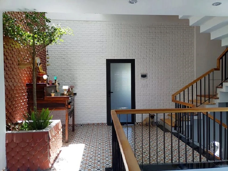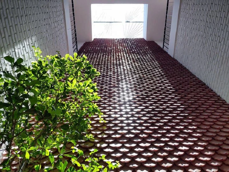 Gạch ngói mũi hài cũng được ốp trên tường ở khoảng sân phía trước nhà.