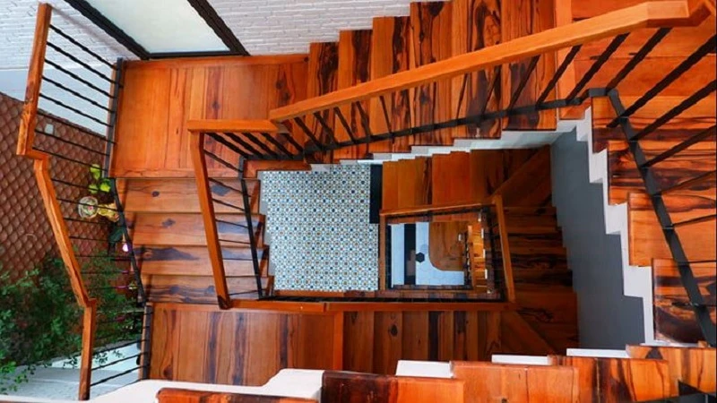 Cầu thang là điểm nhấn của ngôi nhà, được gia chủ chọn màu gỗ đậm để nổi bật với tông màu trắng xung quanh.