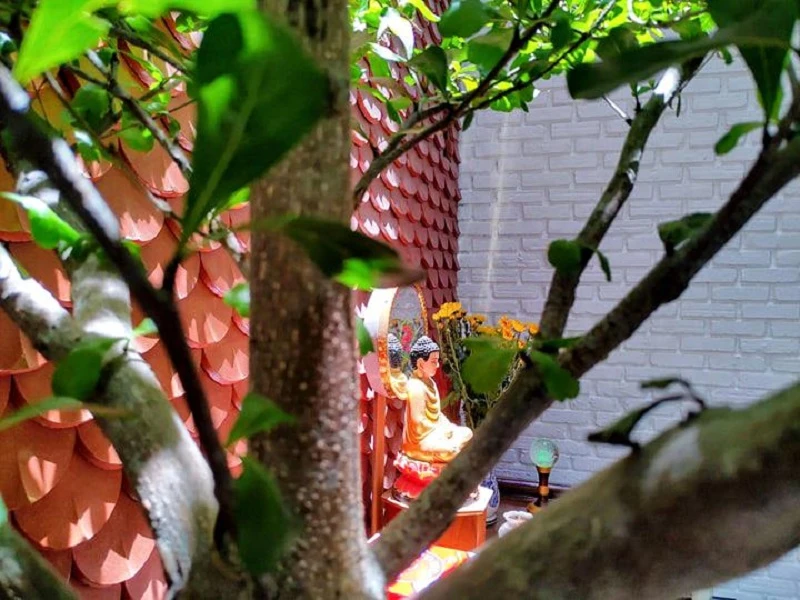 Ngoài ra, phòng thờ được kết hợp với giếng trời được ốp bằng ngói mũi hài.