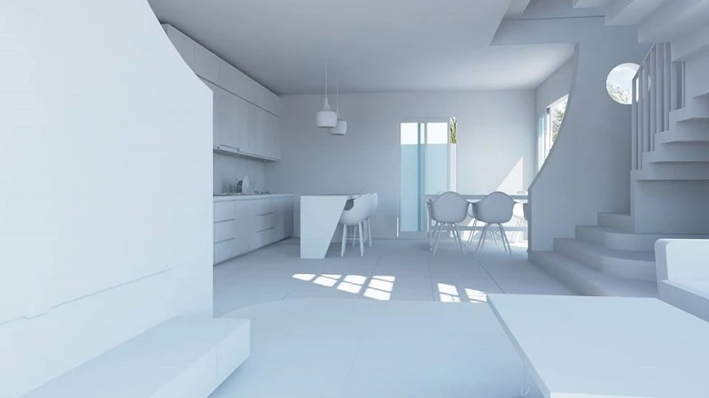 Ngôi nhà được thiết kế ba tầng, ba phòng ngủ và bốn nhà vệ sinh. Đây là phối cảnh khu bếp ở tầng một.