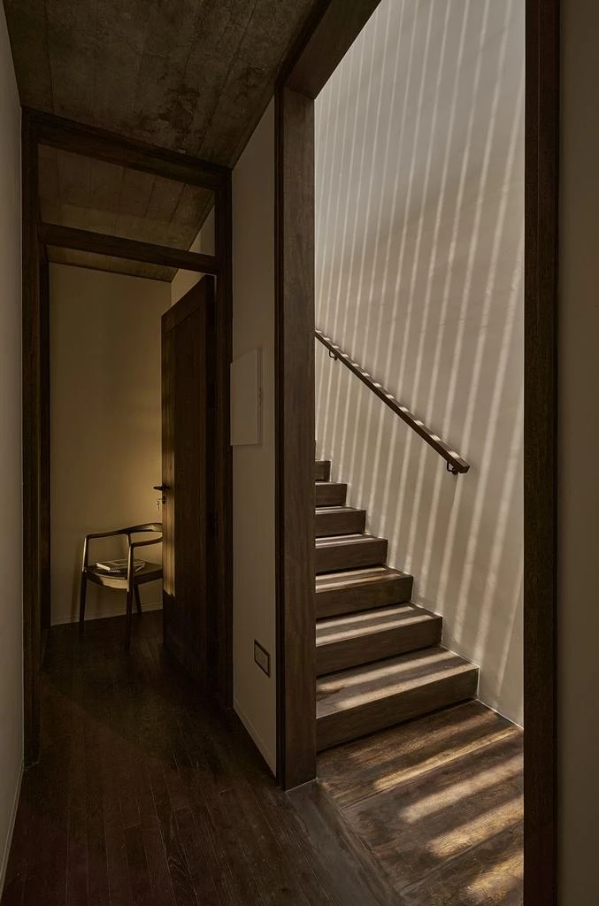 Cầu thang dẫn lên tầng lầu lấy sáng từ việc thiết kế giếng trời.