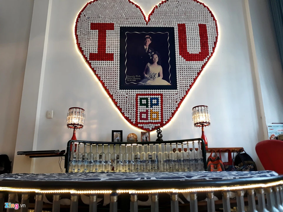 Chiếc giường ngủ của vợ chồng ông Bình làm để kỷ niệm 15 năm ngày cưới. Nặng hơn 100 kg, được kết từ hơn 200 vỏ chai và phải mất nhiều ngày để hoàn thành. Trên đầu giường là một trái tim lớn được ghép từ hàng ngàn nắp chai nhựa.