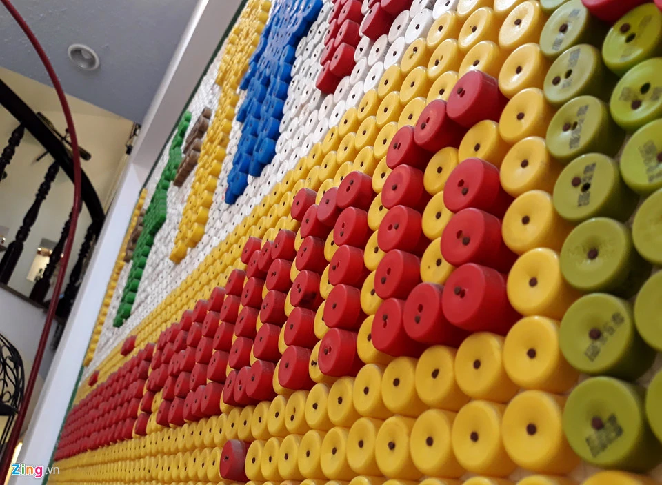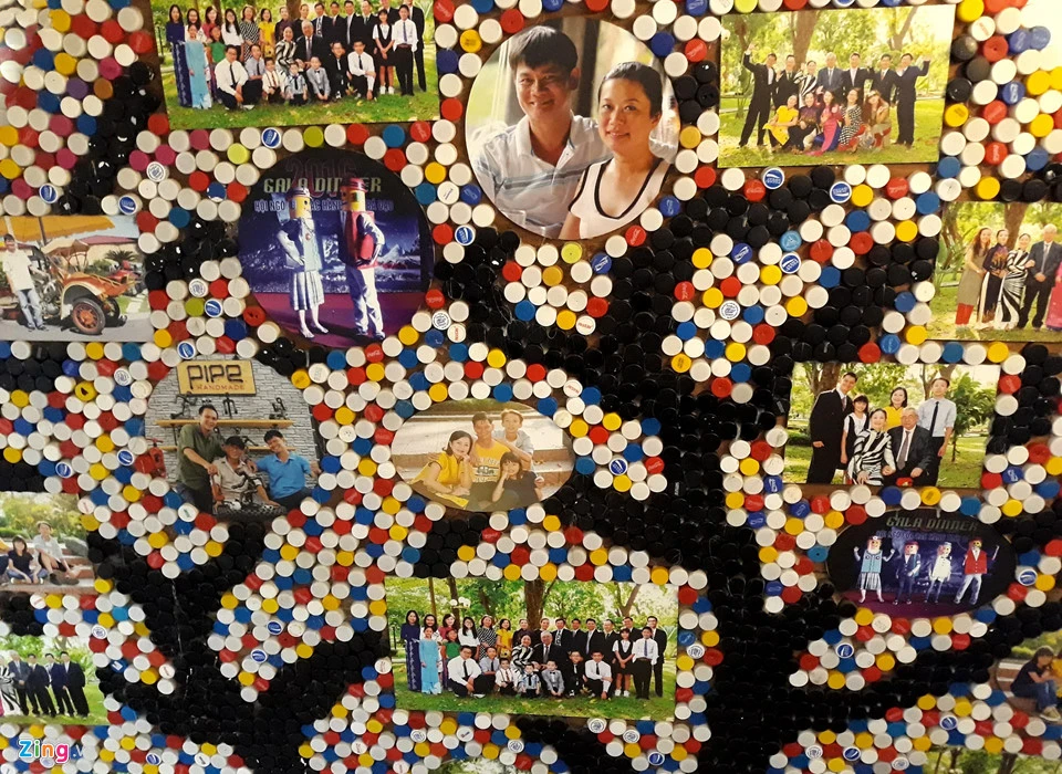 Hơn 4.000 nắp chai nhựa được ghép thành một "cây gia đình" và bên trên là các bức ảnh của nhiều thế hệ trong nhà.