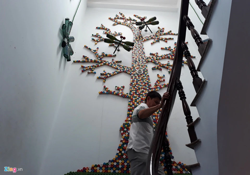 Một "cây gia đình" lớn khác cao hơn 4 m, được ghép ngay cầu thang tầng 3 của căn nhà bởi hàng ngàn nắp chai đủ màu sắc.