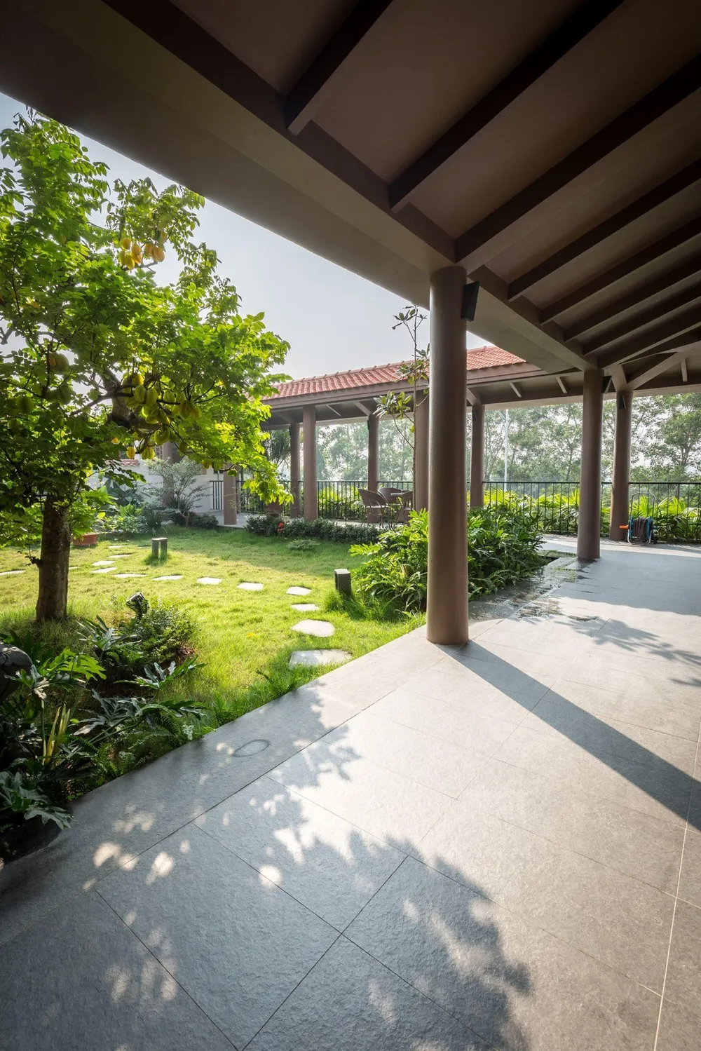 Các không gian chính đều hướng về khoảng sân trong, được bao quanh bởi hệ thống hàng hiên đóng vai trò như một không gian chuyển tiếp giữa trong và ngoài.
