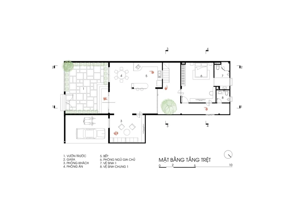 Tầng trệt là một không gian mở hoàn toàn, tràn ngập ánh sáng tự nhiên, bao gồm các khu vực bếp nấu, bàn ăn nhanh gia đình, bàn ăn dài tiếp khách, phòng khách.