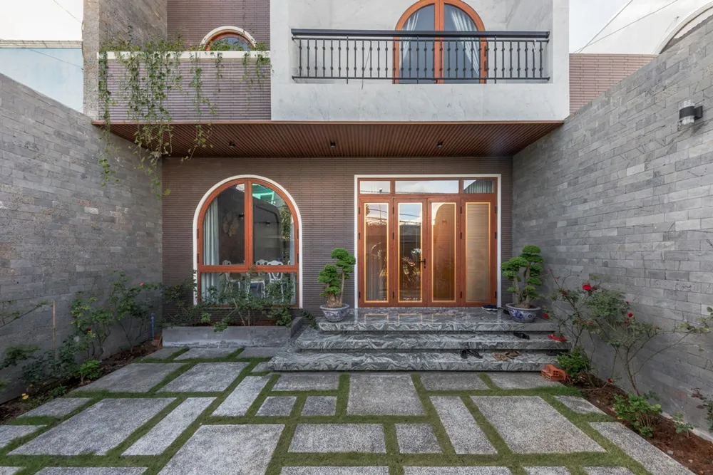 Mặt tiền ngôi nhà là một sự kết hợp hoàn hảo giữa hiện đại và truyền thống. Đó là mái ngói truyền thống cùng các vòm cửa cong gợi lên những ký ức quen thuộc về các ngôi nhà thời xưa cũ và vẫn giữ được nét hài hòa về hình thái kiến trúc với các ngôi nhà lân cận.