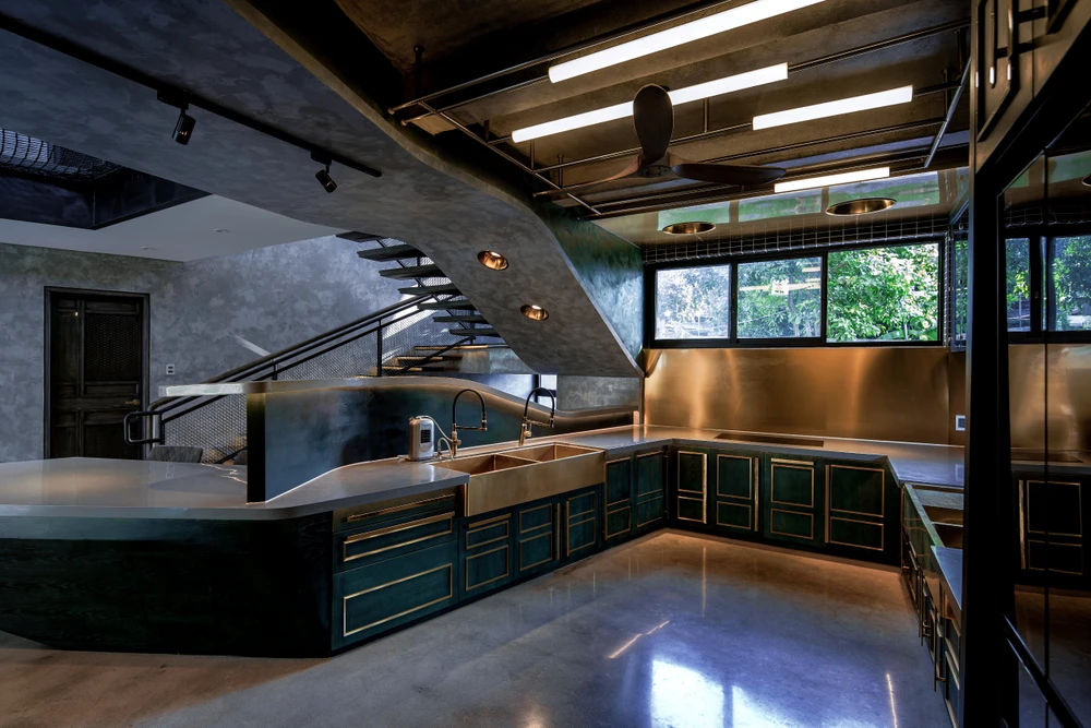 Không những chú trọng về bố cục mặt bằng, về cao độ, khu bếp cũng được ưu tiên với cao độ lớn và sử dụng quạt trần. Việc này giúp giải quyết lượng nhiệt thoát ra bởi nấu nướng khá tốt.