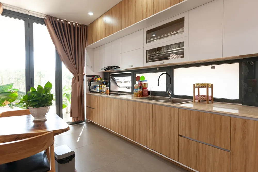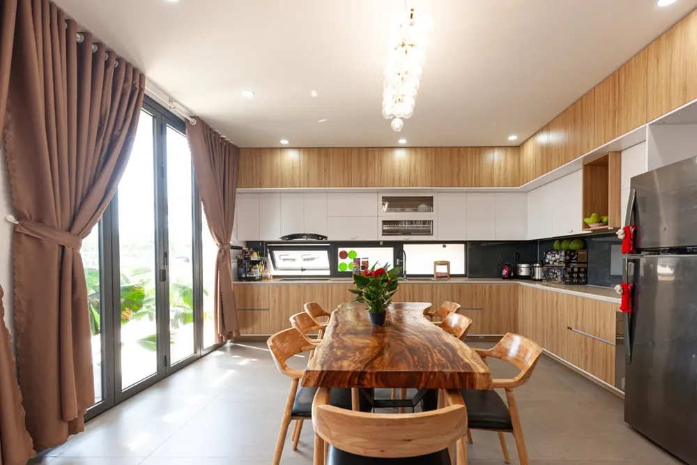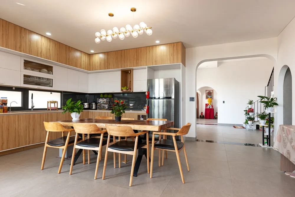 Không gian bếp và bàn ăn hướng ra khoảng cây xanh bên ngoài.