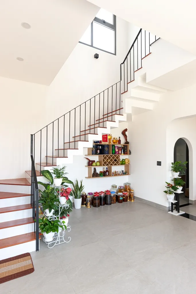 Để giảm bớt sự nhàm chán những góc cầu thang, kiến trúc sư bố trí cây xanh và kệ trưng bày khu vực này.