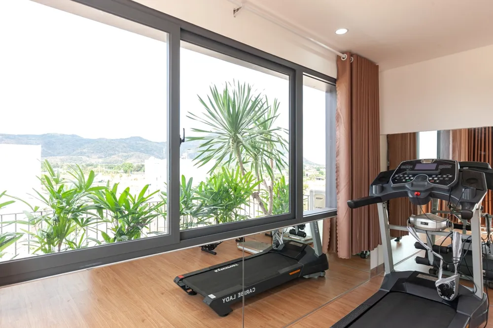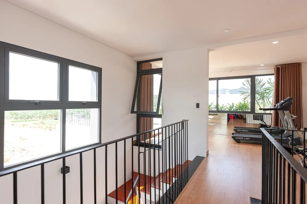 Tầng ba gồm một phòng ngủ khách, phòng gym và sân thượng.