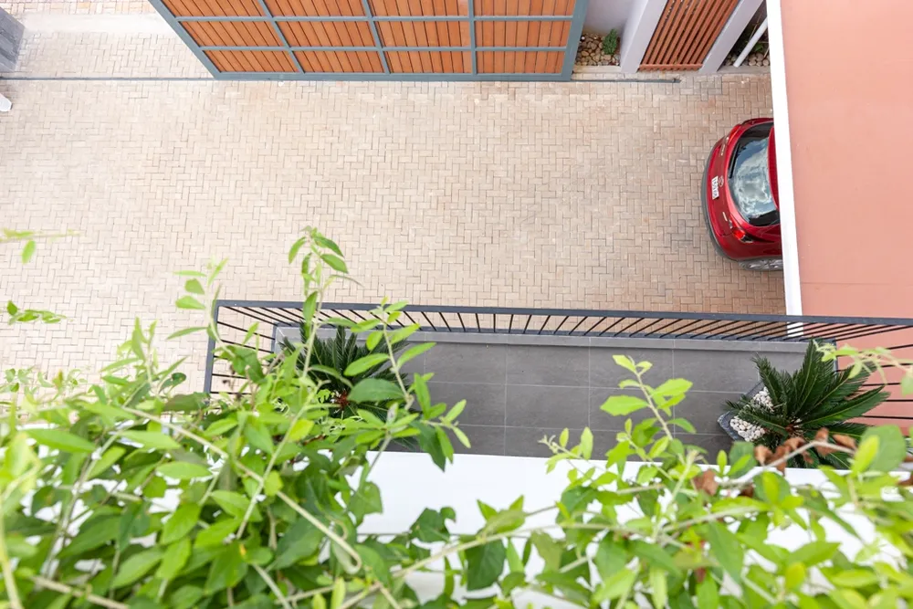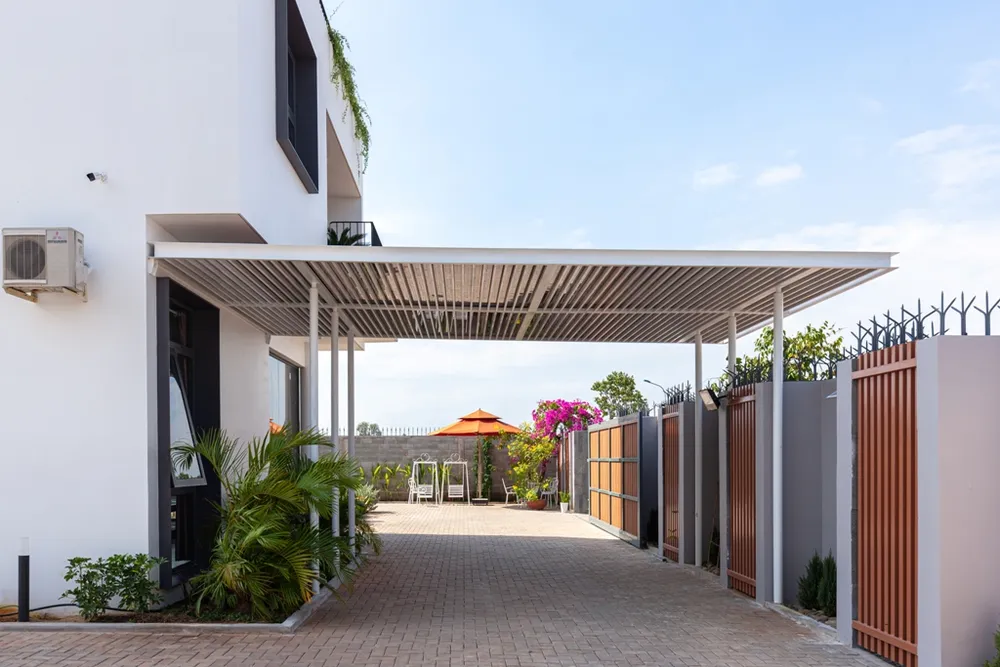 Phía trước mặt tiền nhà được nhấn bởi khối hàng rào ốp đá mạnh mẽ, xen lẫn hệ lam gỗ nhựa, tạo sự kín đáo riêng tư nhưng không bí bách.