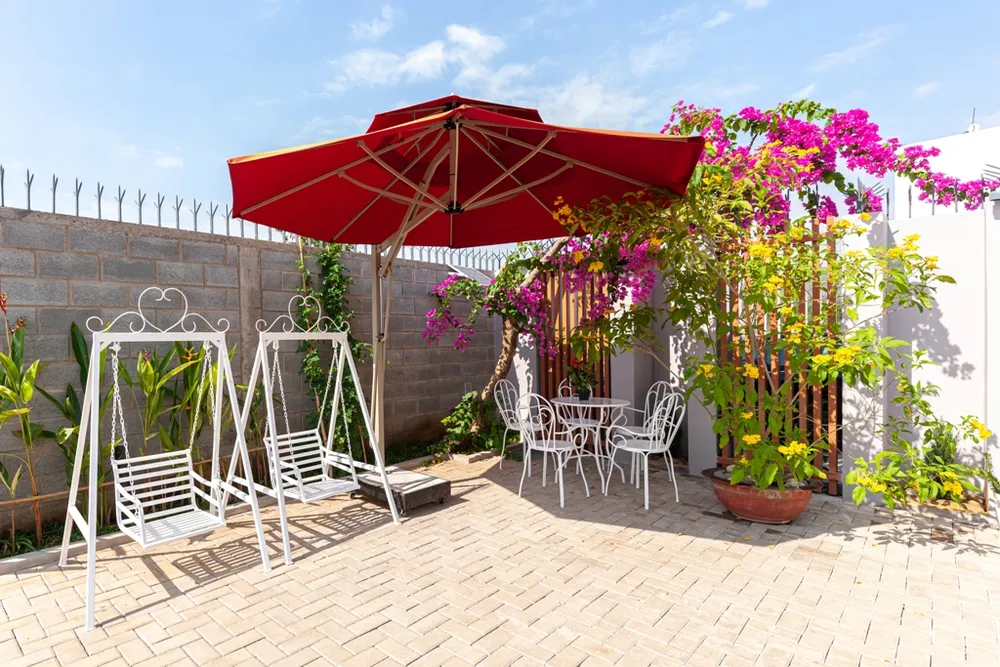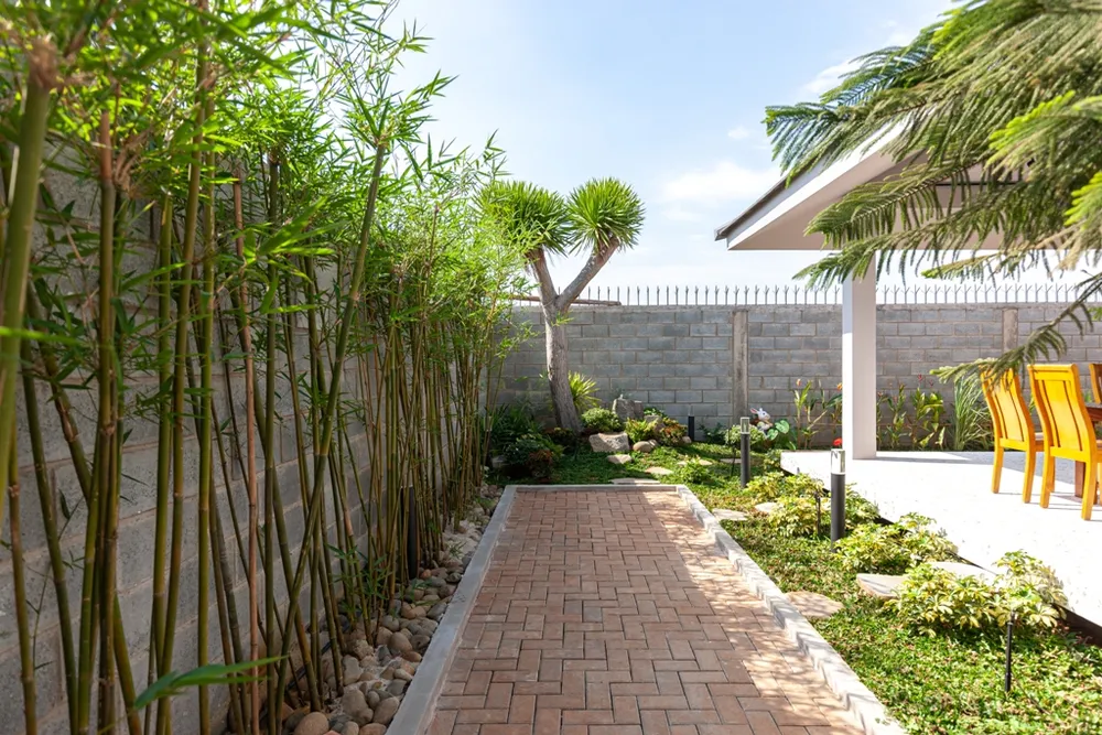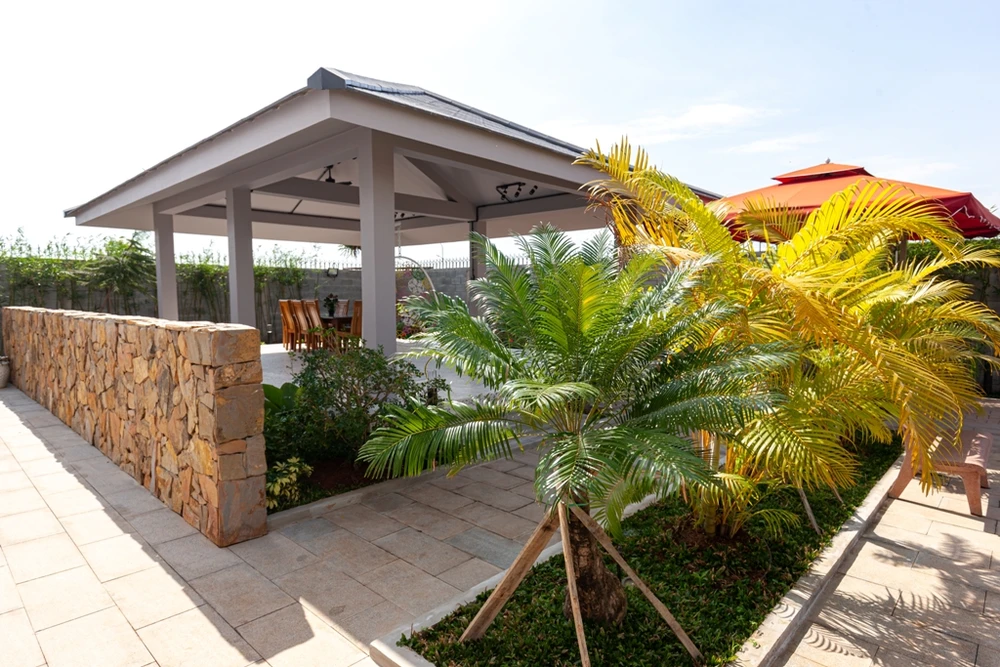 Khu vườn gồm sân tiệc phía bên trái căn nhà, mái hiên trước, hiên sau cùng khối công trình phụ (vệ sinh dành cho khách).