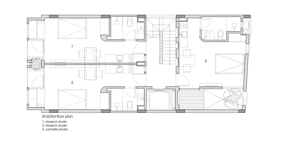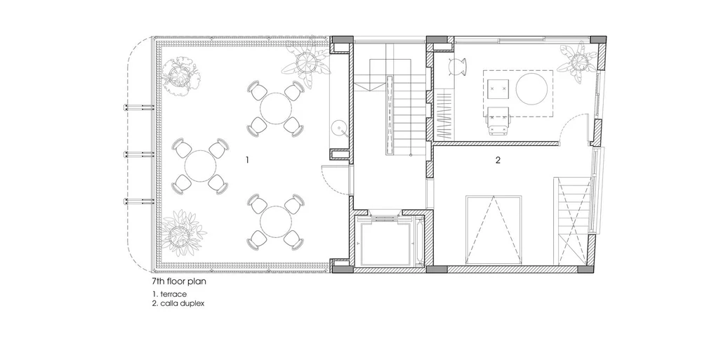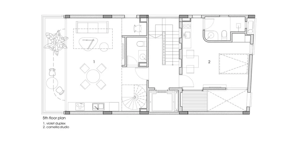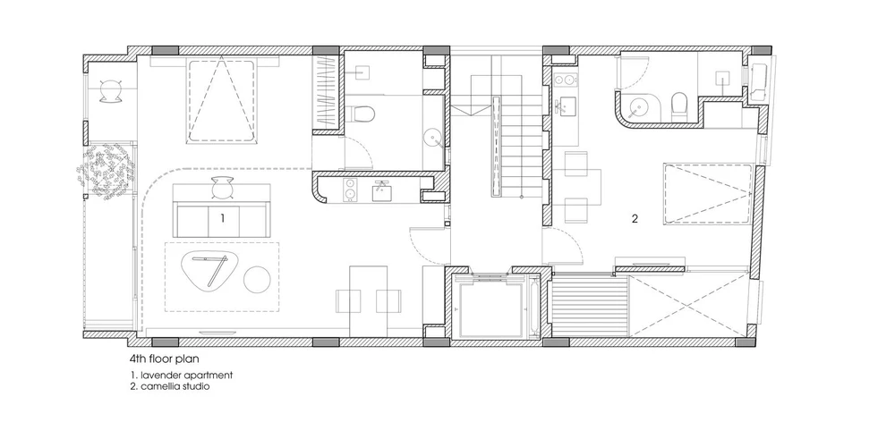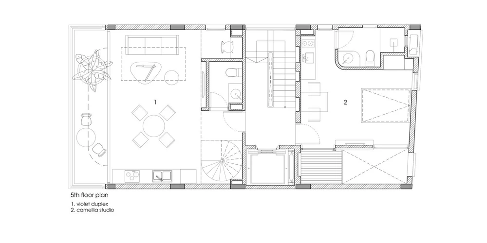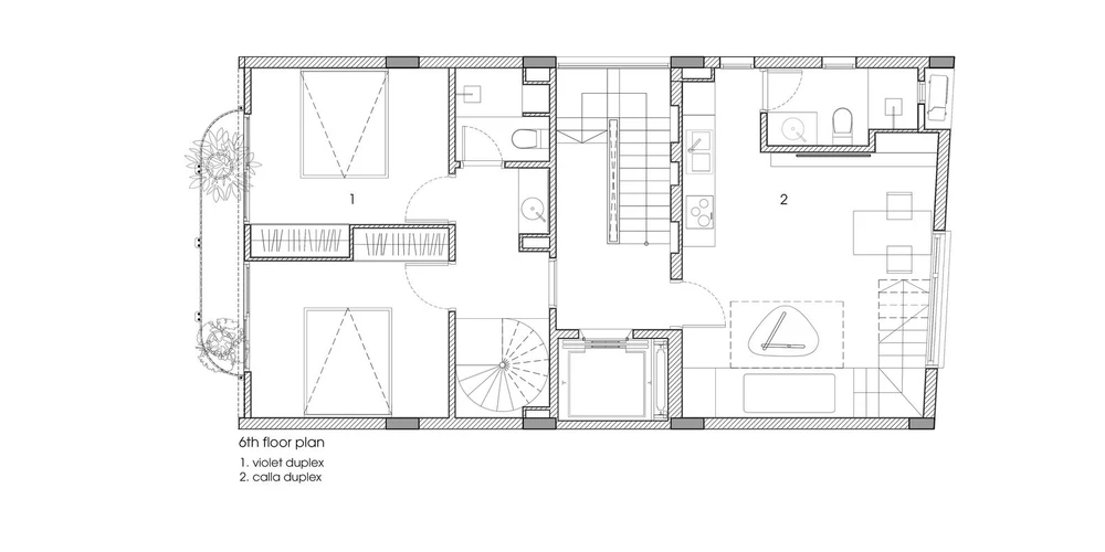 Từ tầng hai đến tầng bảy có nhiều loại hình căn hộ khác nhau. Trên tầng hai và tầng ba có các studio quy mô nhỏ.