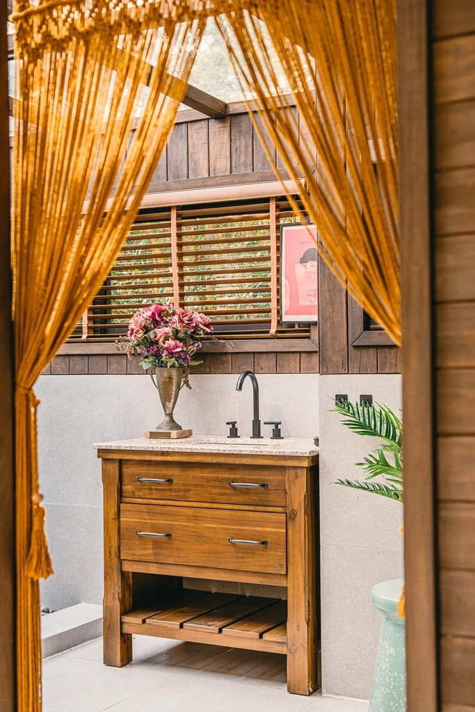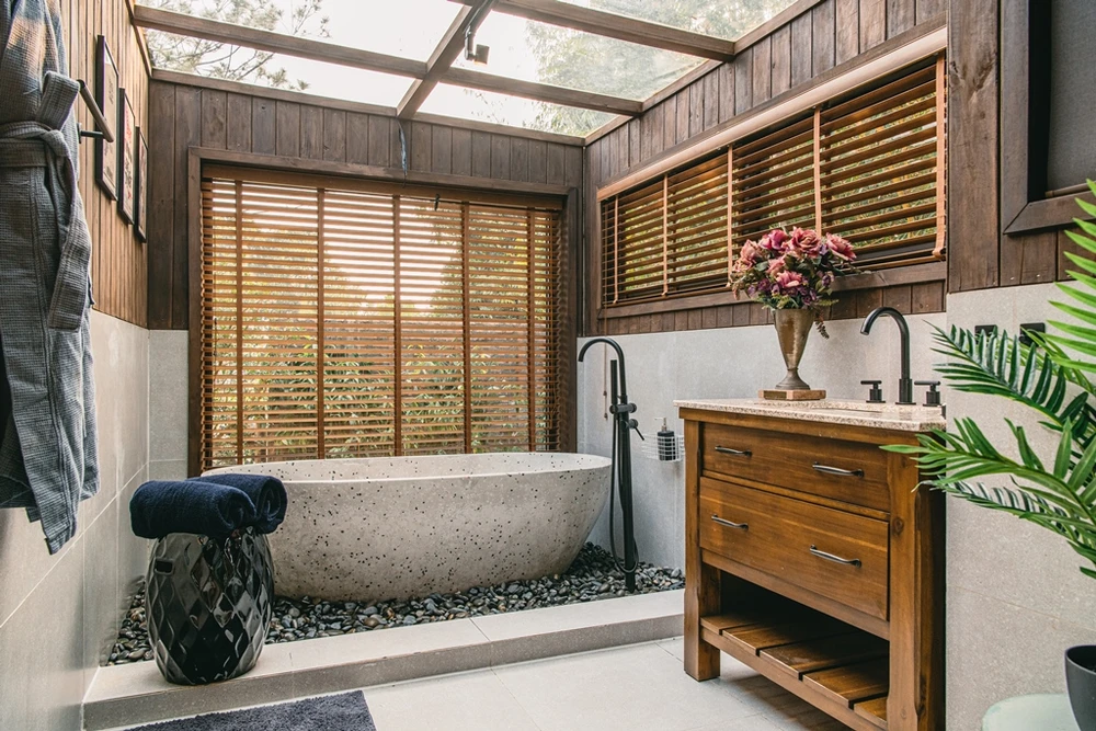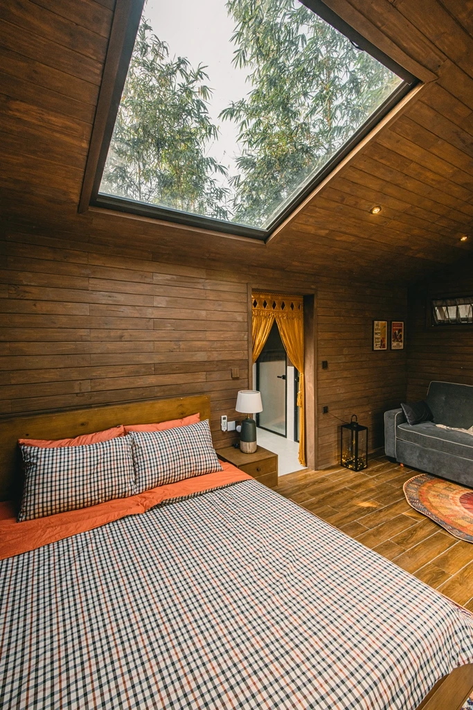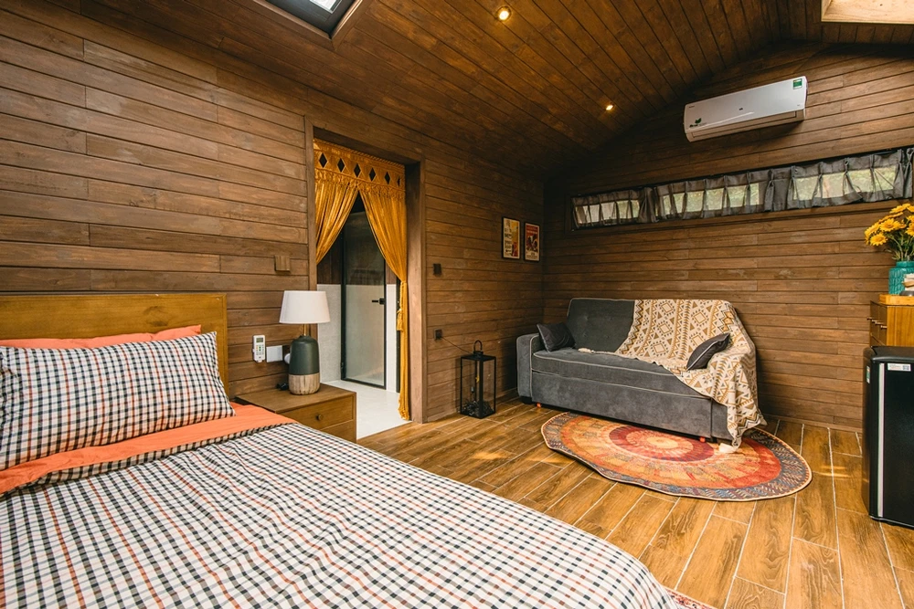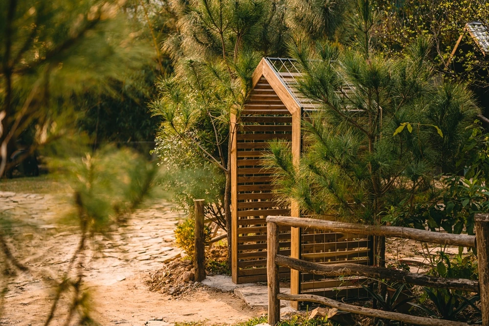 Phần bao bọc bằng gỗ thông được sơn phủ màu gỗ trầm giúp hòa quyện với thiên nhiên.