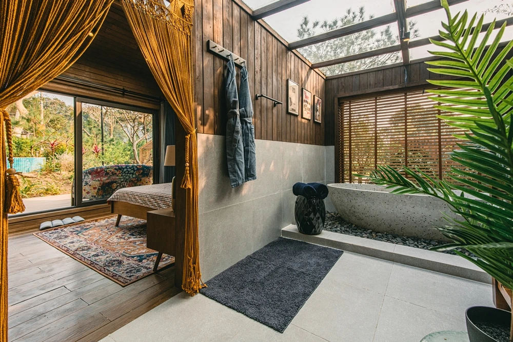 Giữa không gian ngủ và bồn tắm là chiếc màn treo.