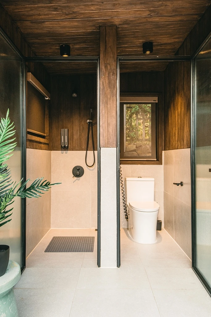 Ngoài ra, khu tắm đứng và nhà vệ sinh được tách biệt bằng hai tấm cửa kính nhằm đảm bảo sự riêng tư mà vẫn khiến tổng thể thoáng mát, không có cảm giác chật hẹp.