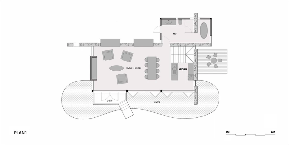 Không gian tầng một được nâng lên giúp chủ nhà có thể ngắm toàn bộ cảnh quan xung quanh, ngăn ngừa côn trùng gây hại và không khí luôn đối lưu. |