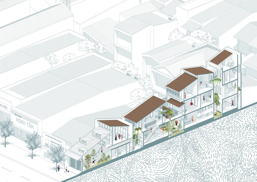 Nhìn từ trên cao các gian nhà được tách ra như các ngôi nhà Bè trong văn hóa sông nước của người miền Tây. |