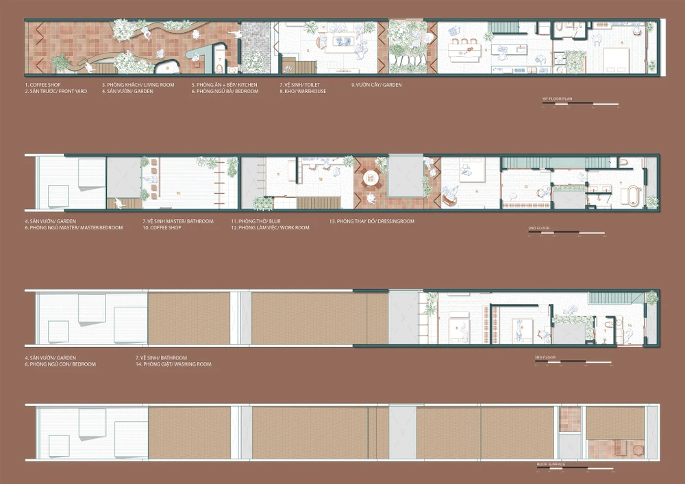 Yếu tố linh hoạt và yếu tố cộng đồng trong ngôi nhà thể hiện qua các khu vườn nằm giữa các không gian. |