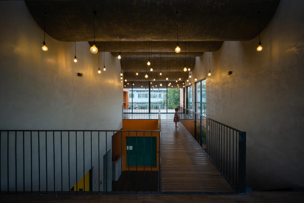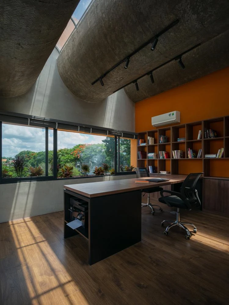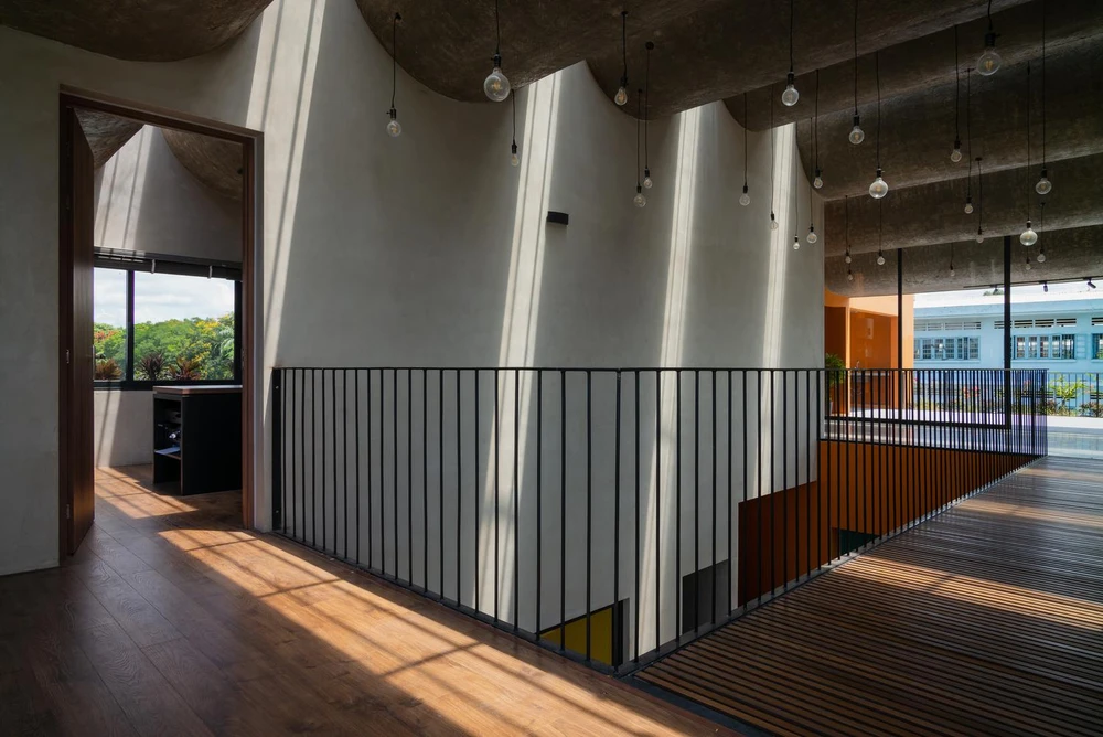 Phần mái cong bằng bê tông khiến bên trong như một sự tương phản nhưng thú vị. |