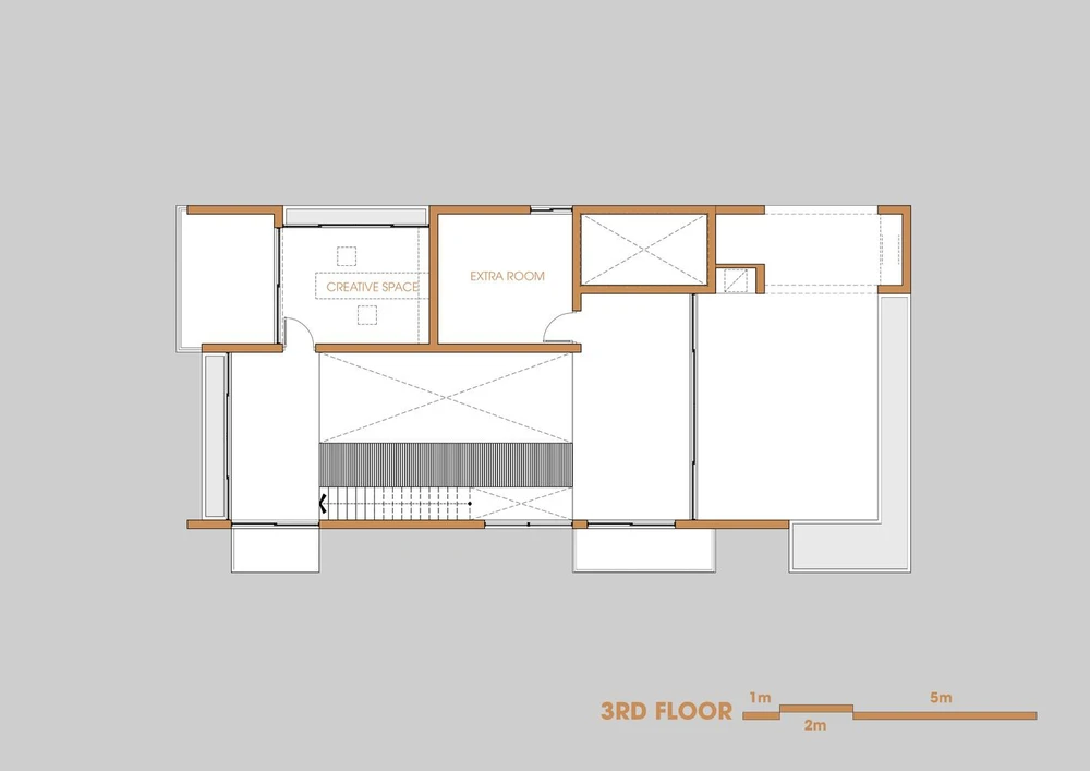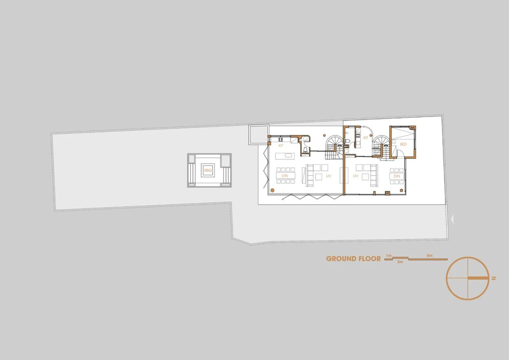 Nhìn từ bên ngoài, chúng ta sẽ thấy công trình như một ngôi nhà nhưng thực ra là hai ngôi nhà trên một vùng đất. |