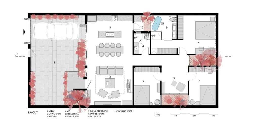 Kiến trúc sư kết hợp các khoảng không trồng rất nhiều cây xanh tạo cảm giác gần gũi, thân thiện. Trong nhà về mùa hè có gió lùa mát mẻ, không khí lúc nào cũng lưu thông tự nhiên. Về mùa đông thì kín đáo ấm áp.