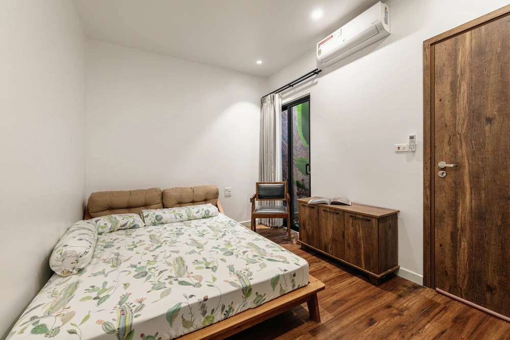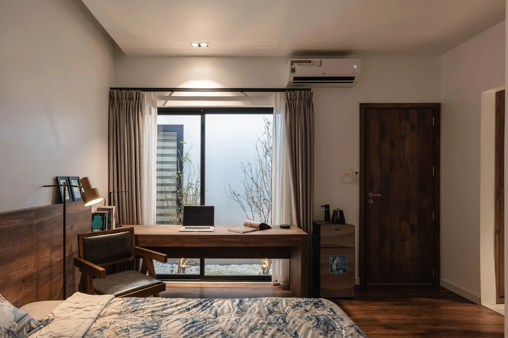 Phòng ngủ kết nối với giếng trời khiến không gian này thông thoáng và mát mẻ.