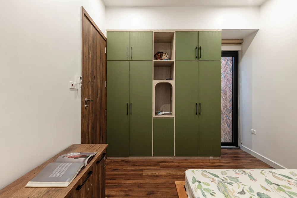 Kiến trúc sư bố trí hệ tủ âm sát tường khiến không gian sử dụng khác cho các thành viên rộng hơn.