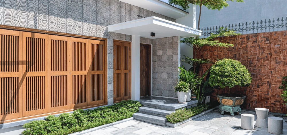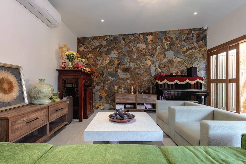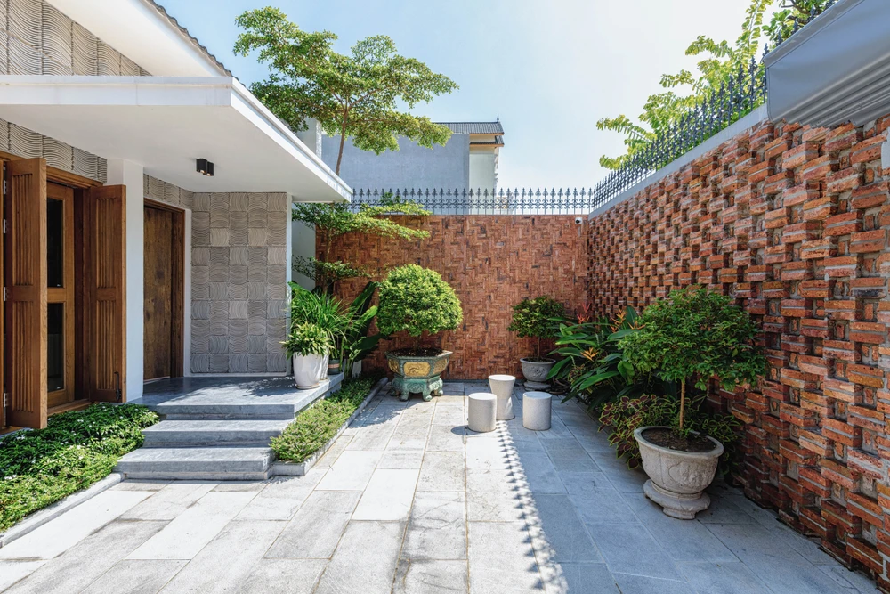 Ngôi nhà mang phong cách nhiệt đới đặc trưng, với vật liệu gạch, đá tự nhiên đều là vật liệu bản địa của Thanh Hóa.
