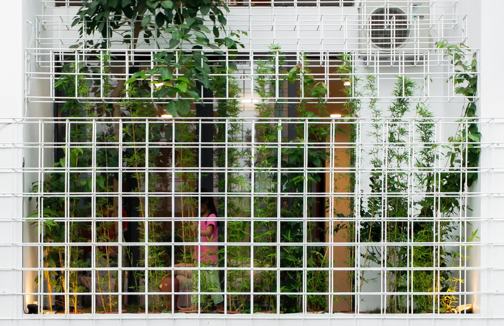 Mặt tiền bằng lưới vuông trải dài khắp công trình.