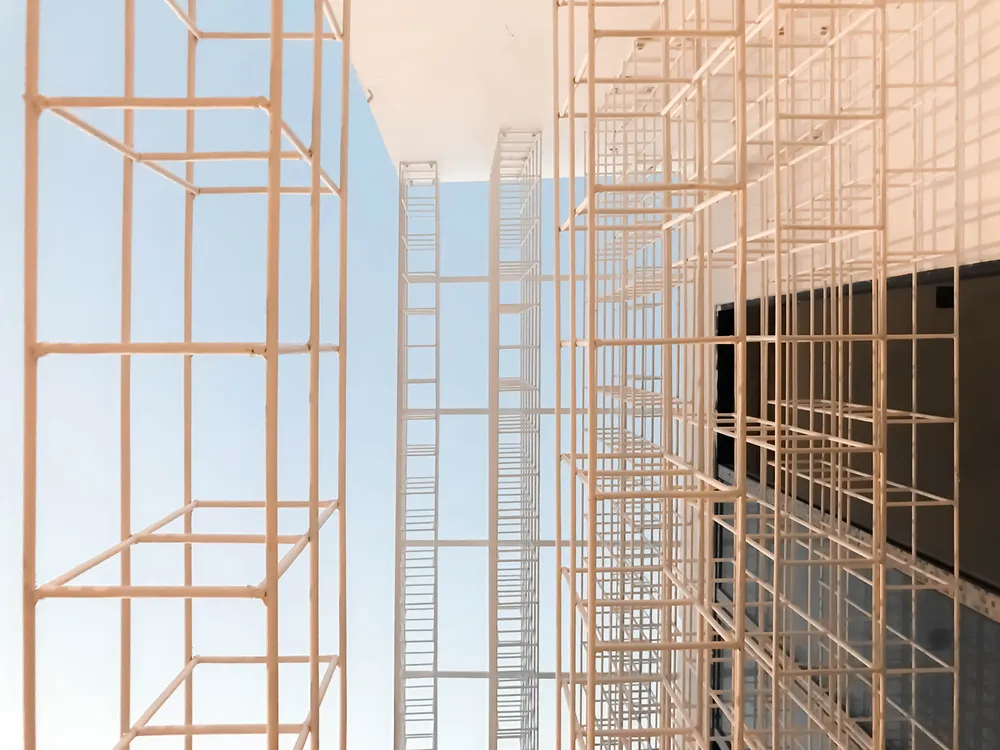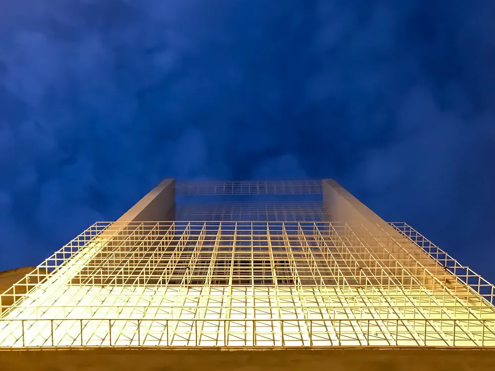 Mặt tiền được làm bằng các thanh tròn 10 mm có loại cấu trúc dựa trên hình dạng lưới vuông.