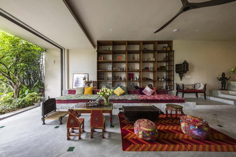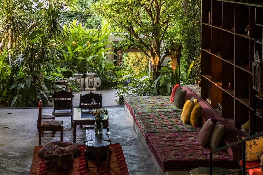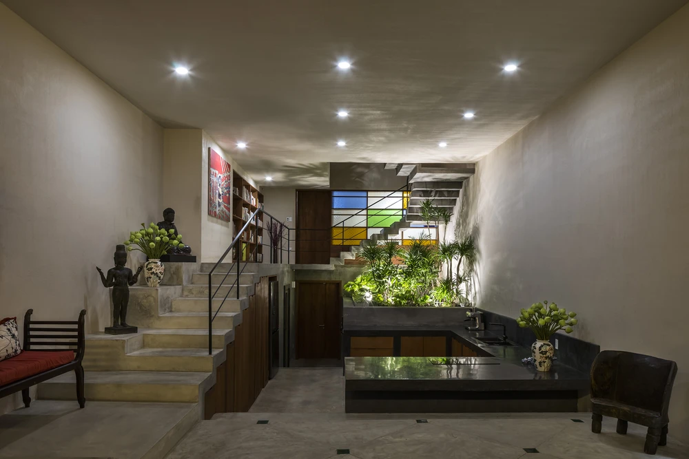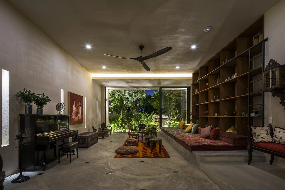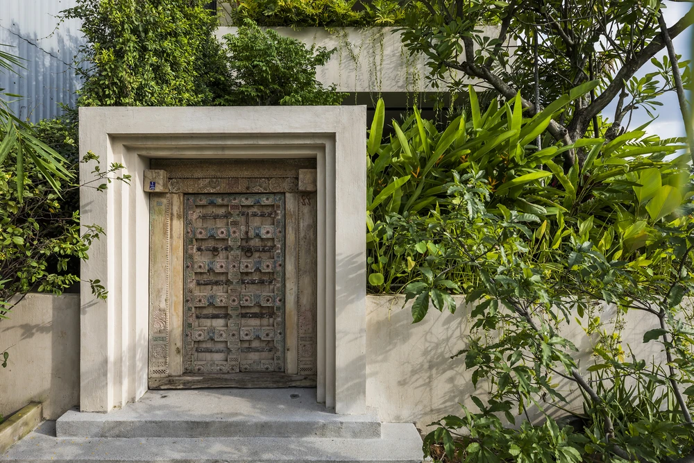 Tầng trệt là không gian của phòng khách. Từ cánh cửa kiên cố kiểu Ấn Độ lõm vào trong, gia chủ sẽ đi qua một khu vườn xanh mát.