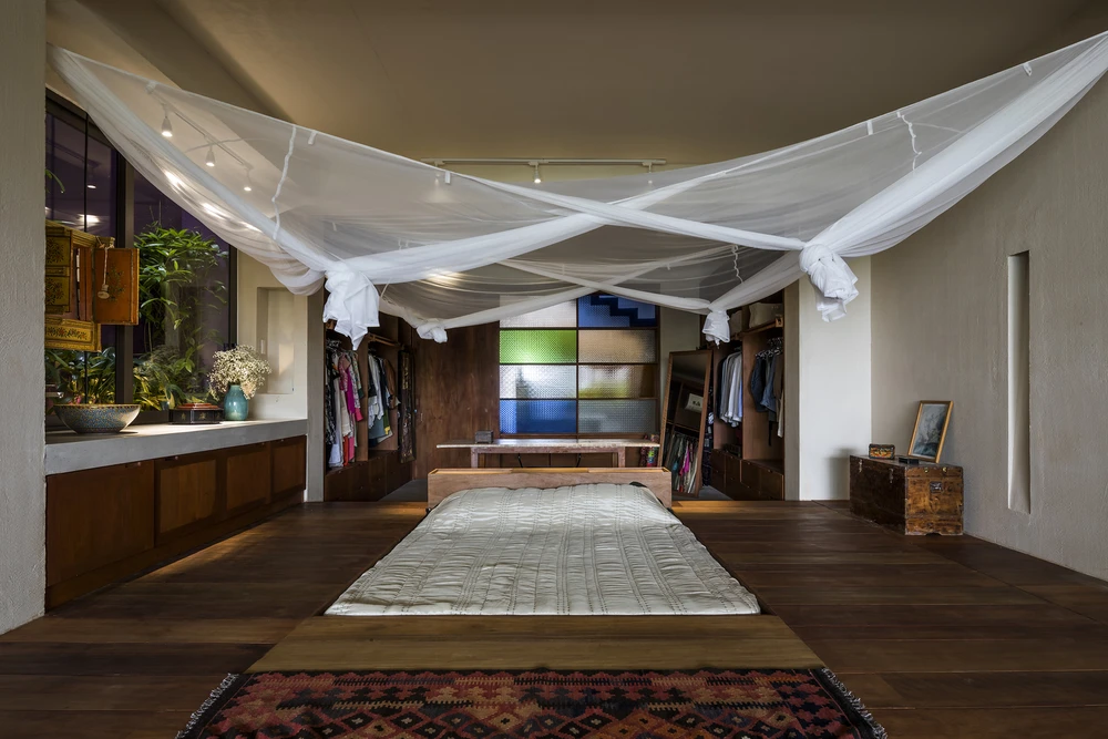 Nội thất trong phòng ngủ được làm chủ yếu bằng gỗ và theo kiểu cổ. Chiếc nệm được đặt ngay ngắn vào vị trí âm xuống mặt sàn, mang lại cảm giác thoải mái, gọn gàng cho chủ nhân.