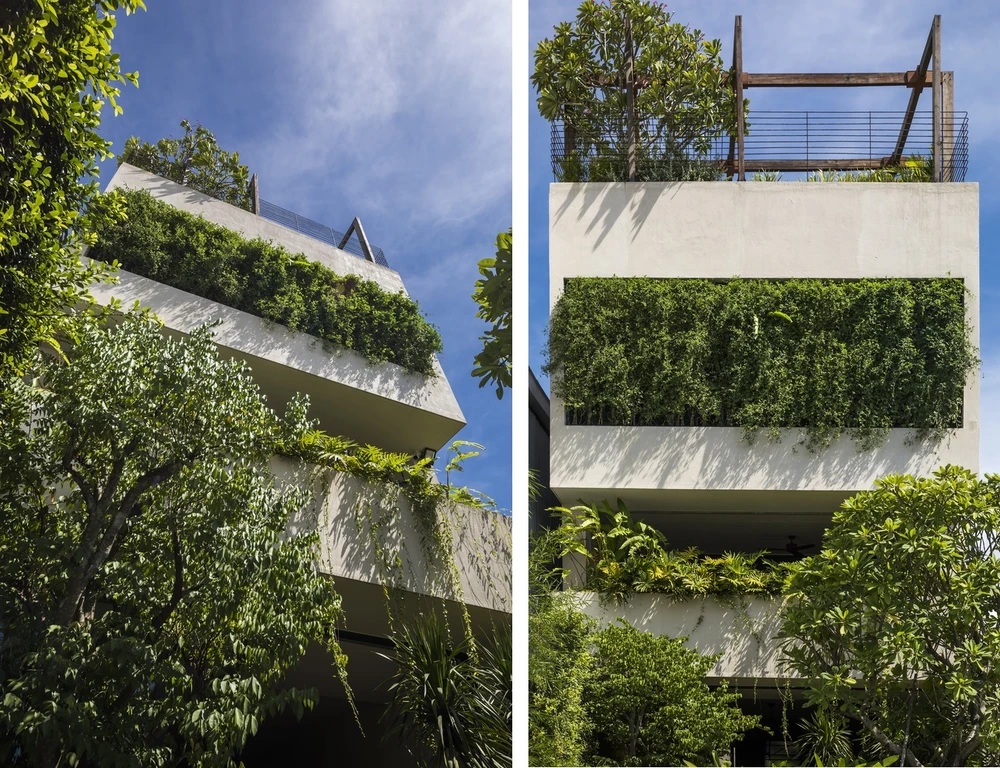 Mặt tiền nhà được phủ bởi nhiều lớp thảm thực vật với cây xanh trải dài từ tầng một lên đến sân thượng. Cây xanh trở thành yếu tố thiết kế đầu tiên cho một không gian xanh sống chất lượng, chiếm khoảng 15% diện tích mỗi tầng.