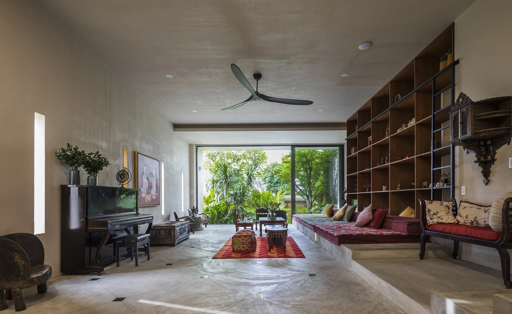 Không gian phòng khách lấy sáng từ nguồn ánh sáng tự nhiên của khu vườn.