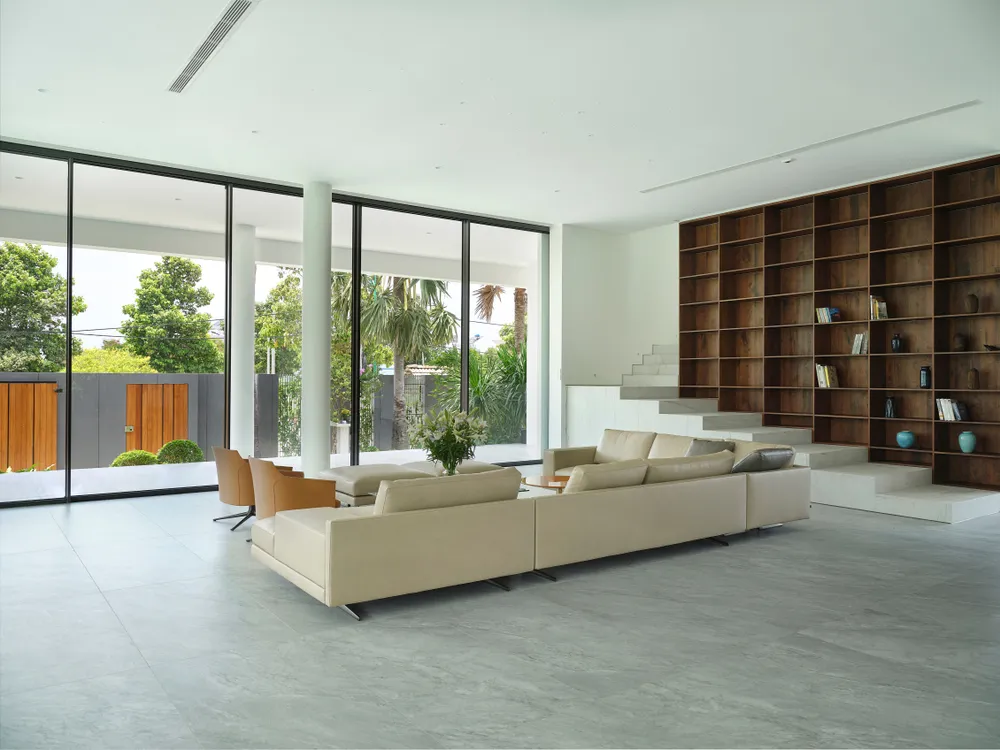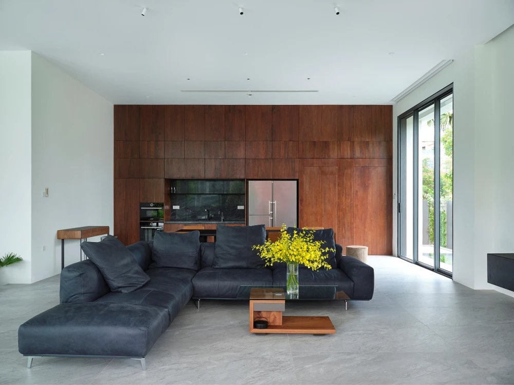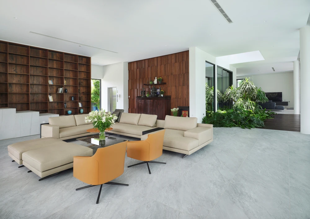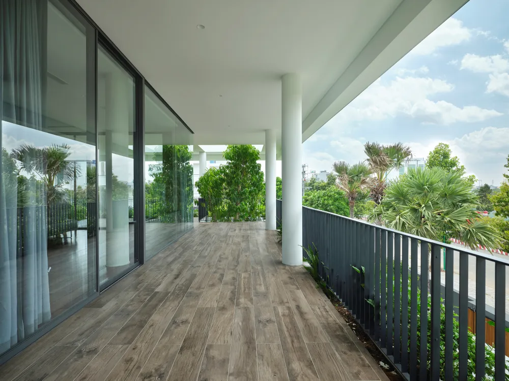 Nhờ vào khu vực mảng xanh làm che lấp đi khối công năng, khoảng chuyển giao cũng trở nên vô cùng mềm mại, không bị quá khô khan.